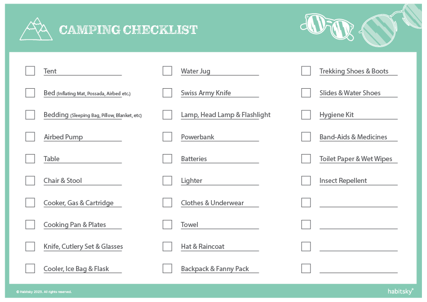 Yukarıdaki Kampa Giderken Alınacaklar Listesi'nin çok daha güzel tasarlanmış ve yazdırılabilir halini Habitsky.com web sitesinden ücretsiz alabilirsiniz. Ürünü sepete ekledikten sonra HOTELCAMPINGSKYFREE kupon kodunu girmeniz yeterli. İşlemi tamamladıktan sonra dosyayı hemen indirebilirsiniz.👇